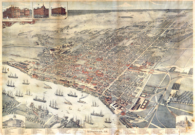 This large, full color bird’s eye view of Savannah was “copyrighted, drawn and published” by August Koch in 1891 by Morning News Lithograph.